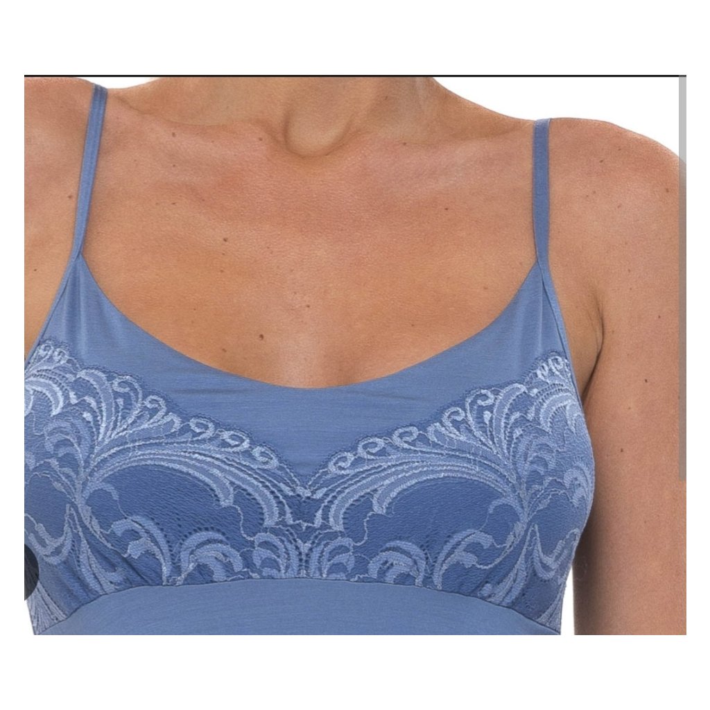 Dámská noční košilka na ramínka z velmi příjemného modalového materiálu. V části přes prsa je další vrstvě našitá krajka, která dodává košilce eleganci a velmi zajímavý vzhled. Ramínka jsou nastavitelná.