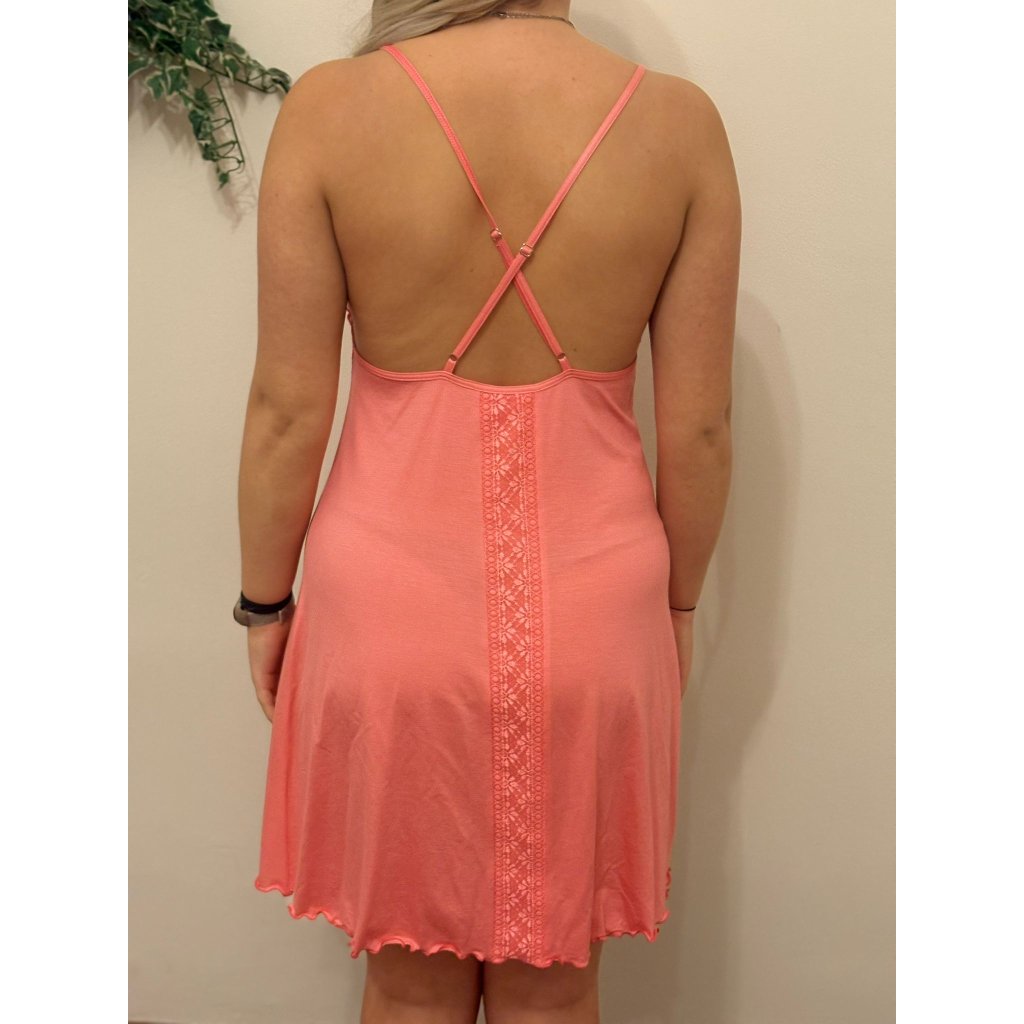 Dámská noční košilka na ramínka z velmi příjemného modalového materiálu, košíčky pošité krajkou, stejně jako boční pruhy.