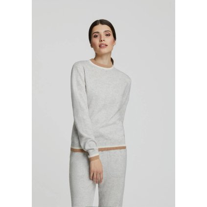 Elegantní svetr s raglánovými rukávy v jemné světle šedé. Maličko ležérní, příjemně elegantní vzhled, ozvláštněno detaily a pruhem, který zdůrazňuje sofistikovanost a eleganci kašmíru a podtrhuje siluetu. Spíše chladná a elegantní světle šedá barva zkombinovaná s mikinou ve světle šedé vytvoří celkový dojem velmi elegantní. Kontrastní proužky se na obou modelech zajímavě propojí. A hlavně budete v maximálním pohodlí.