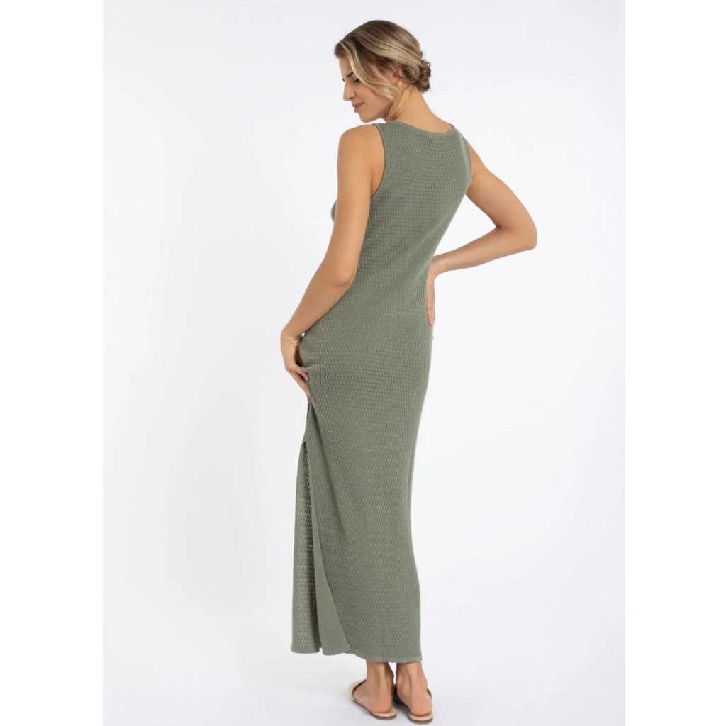 Elegantní maxi šaty bez rukávů s elegantním bočním rozparkem.