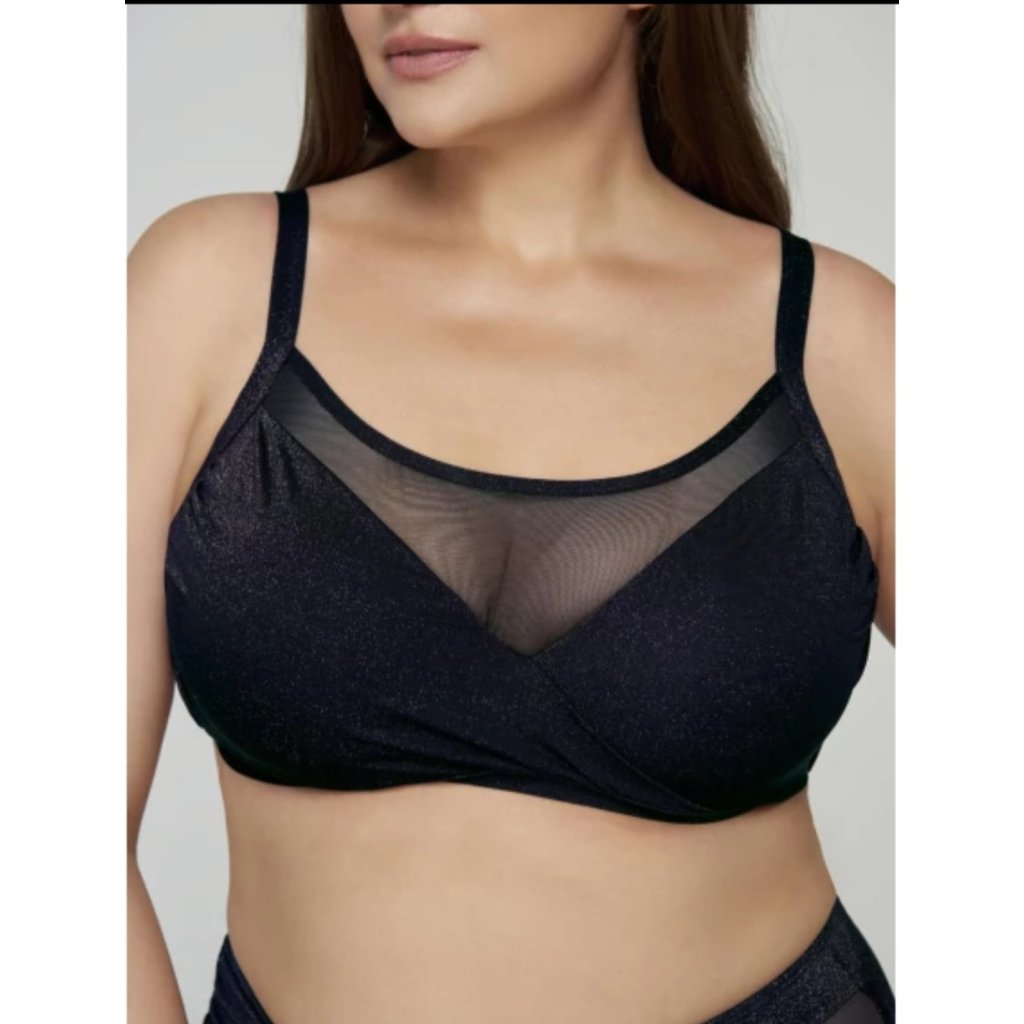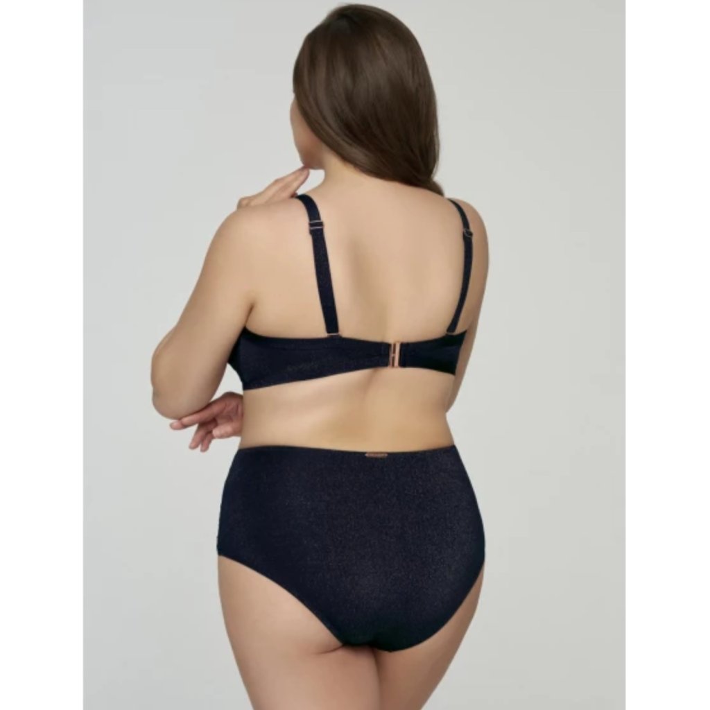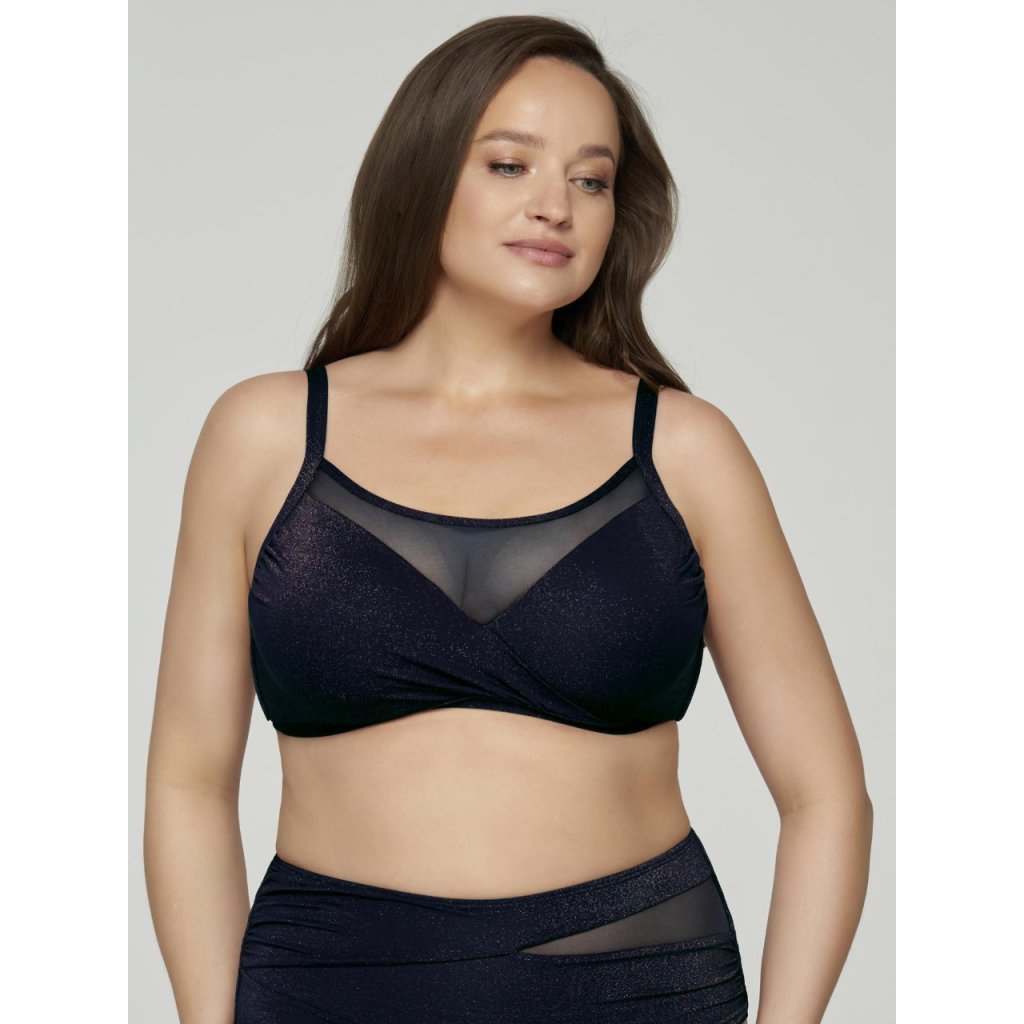 Dámský plavkový komplet Starlight v elegantní modré barvě se zlatými flitry spojuje styl a pohodlí. Vrchní díl s tvarovanými košíčky a kosticemi poskytuje oporu a krásné tvarování, elastická síťovina dodává moderní vzhled. Nastavitelná ramínka a pohodlný střih zajišťují perfektní nošení na pláž i k bazénu.